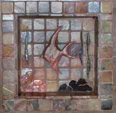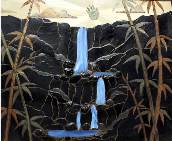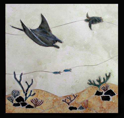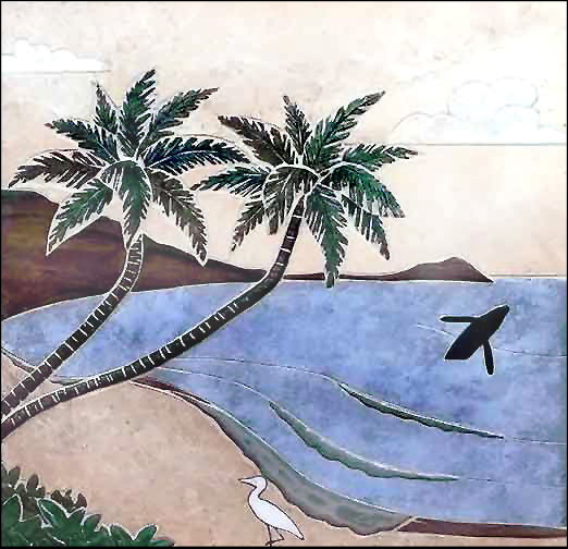 "Dynamic water beach scene" Water sand and sky are ceramic, The rest is 3D carved stone. All stone colors are naturally occurring. Size: 60" x 24" (ships in 2 pieces) 4 weeks fabrication time. (sold) $5,500 |