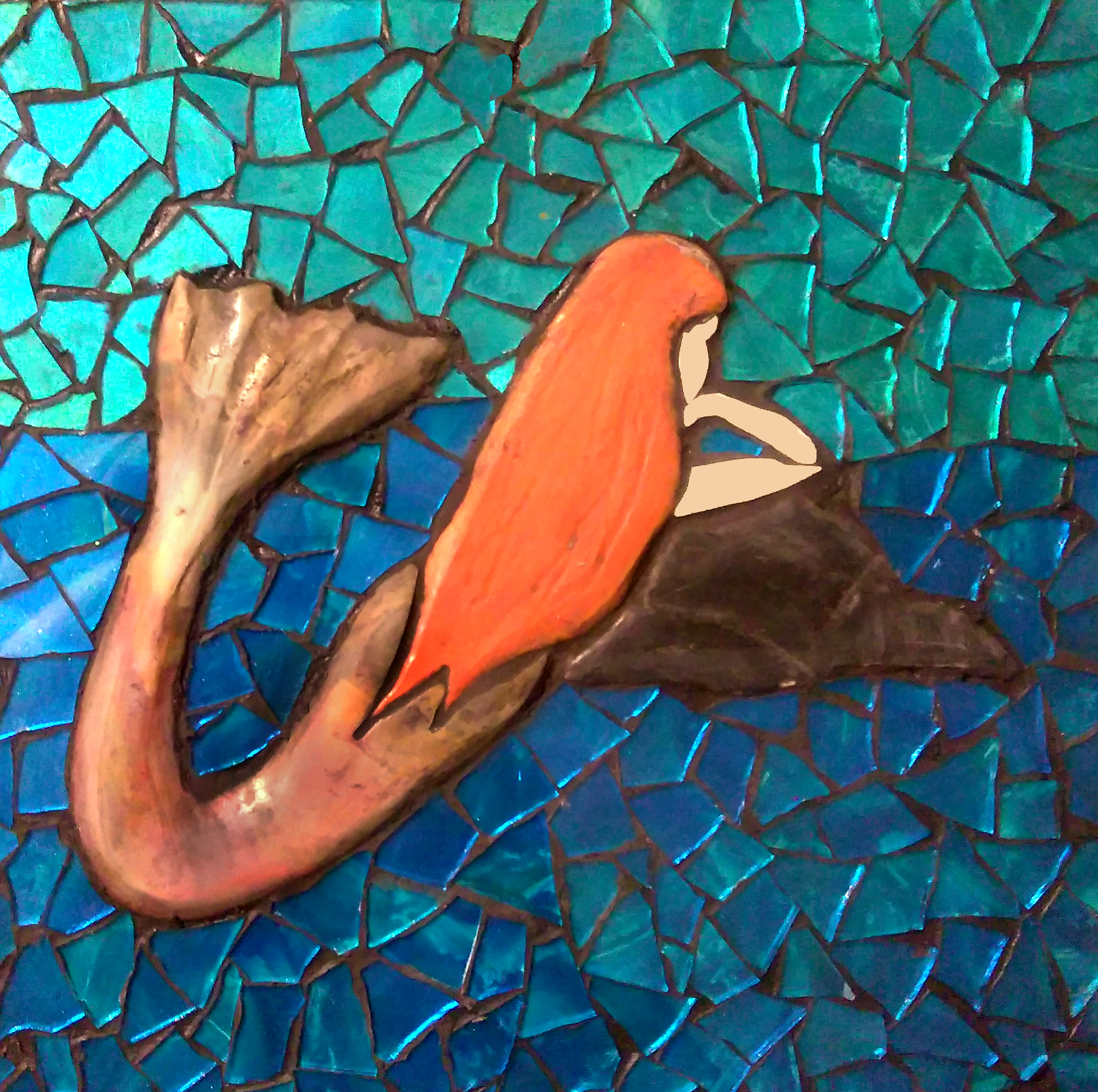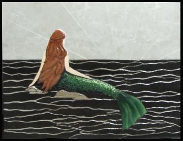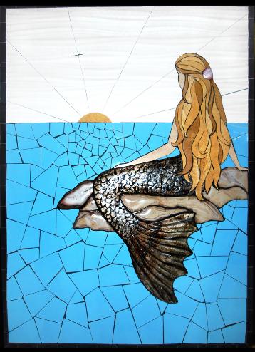 Made to order ~ 5" minimum size. 3ftx4ft maximum size unless set directly on the wall by me in person. Max size 6ft tall. Options include glass or ceramic background, 5 body positions. Fin and hair color are whatever you want. Fabrication time on small size is 3 days each and 3 -4 weeks for large size.(depending on the background desired. The sunrise takes longer. I can make it |